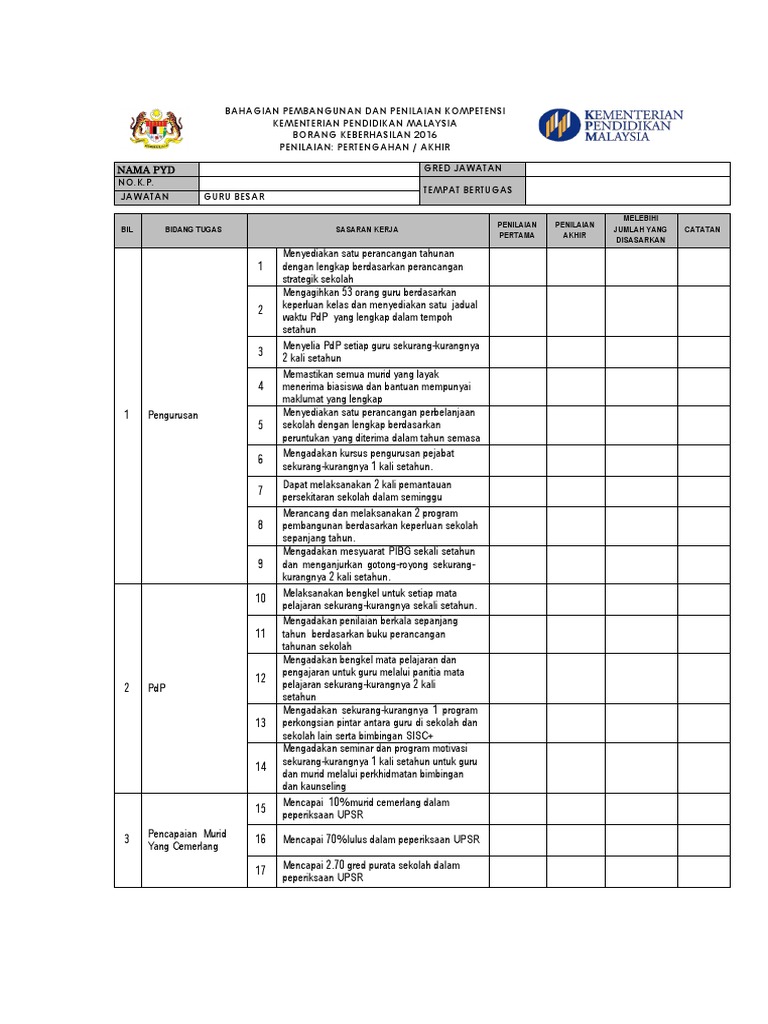 Ketiga-tiga elemen berikut perlu dipertimbangkan secara profesional semasa membuat penilaian sasaran keberhasilan yang telah ditetapkan iaitu. Bahagian pembangunan dan penilaian kompetensi kementerian pendidikan malaysia borang markah keberhasilan tahun 2016 nama pyd gred jawatan nokp. Bilangan item perlu berbincang dengan penilai pertama dan kedua.